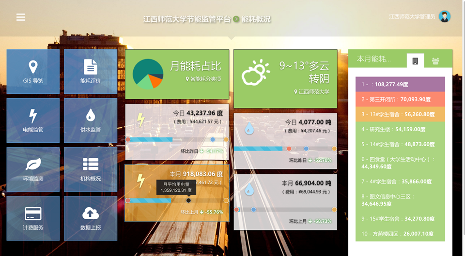系统能够快速实现园区内建筑的水、电、气、供暖等各种能耗数据的实时采集,并对园区内公共照明、路灯、空调、重要设备等进行远程控制管理,以及空气质量、水质监测、太阳能供热等各子系统及仪表终端进行分布式节能监测与集中化管理;达到能耗清晰化、数据可视化、管理数字化、分析图表化、能耗指标化、消费合理化;使管理者对园区内的能源成本比重、能耗数据趋势有准确的掌握;为客户建立一套能源监管与智能服务为一体的能耗监管动态体系,为降低能耗成本服务于客户。共同推进合理使用能源,促进社会节能。